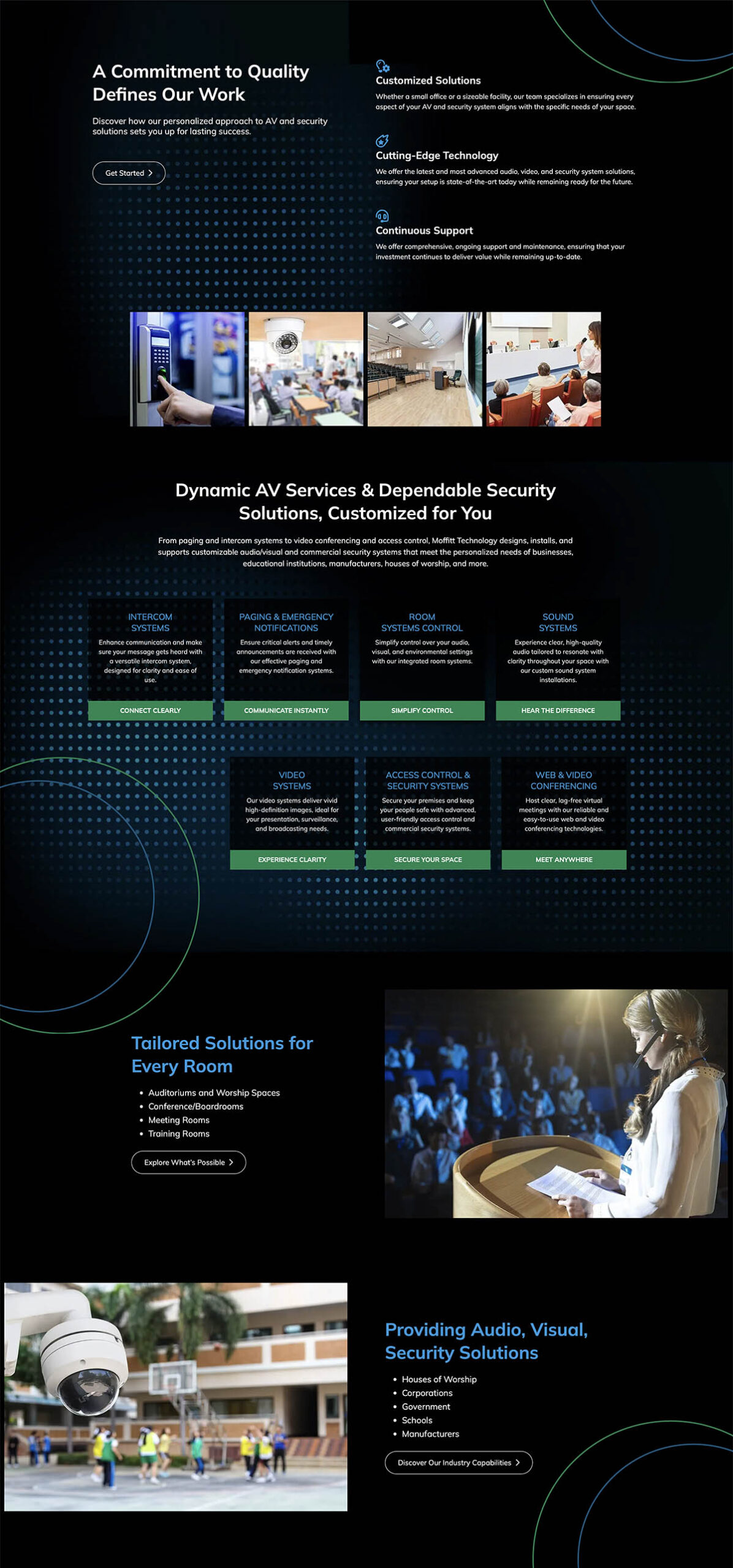 The primary goal of redesigning the Moffitt Technology website was to replace an outdated site with a modern, responsive, and authoritative digital platform that clearly communicated the company’s comprehensive service offerings, commitment to customized solutions, and deep industry expertise across sectors like corporations, education, and houses of worship. The new website needed to establish Moffitt Technology as a trusted partner and facilitate a smoother journey for potential clients seeking high-quality AV and security integration. My role encompassed the process from ideating the UI/UX design to front-end/back-end development, content integration, and deployment.