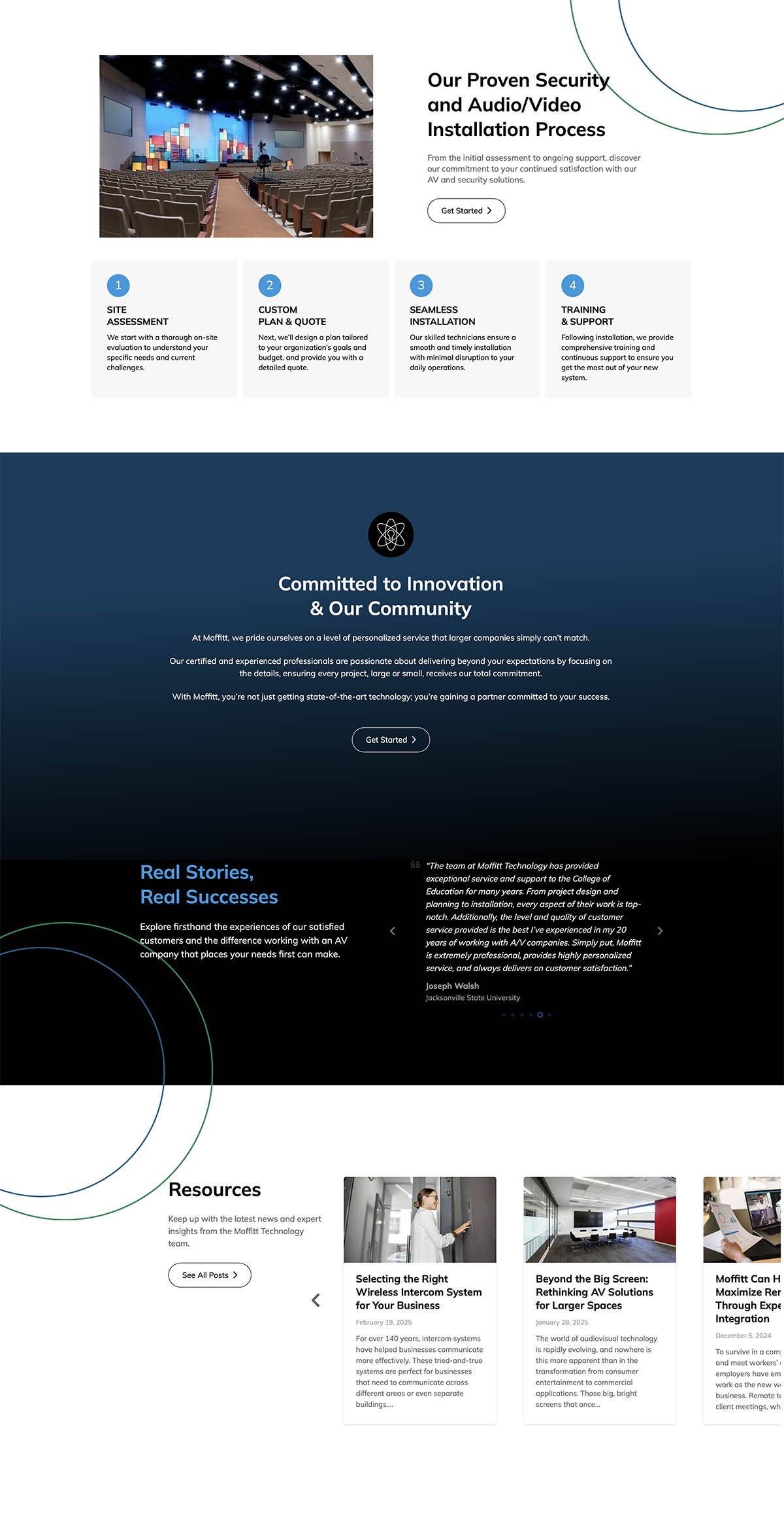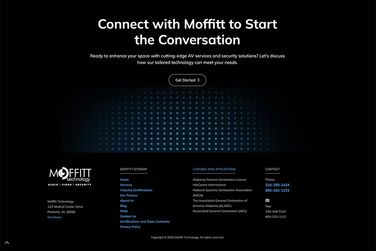 The new website, was architected to seamlessly guide visitors through Moffitt’s services, including sound systems, video conferencing, access control, and emergency notification systems. I prioritized a more techy but professional look which enhances the user experience and leans toward giving the user a feel for their service offerings. A dedicated section showcases the company’s four-step methodology and includes authentic client testimonials, which were integrated to build immediate trust and credibility with commercial decision-makers.