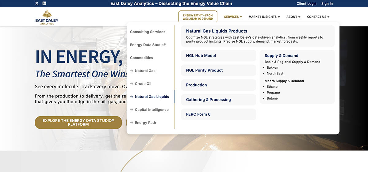 A significant enhancement was the introduction of a Mega Menu under the Services tab in the navigation. This feature was designed to provide users with a comprehensive overview of East Daley’s offerings at a glance. The Mega Menu organizes services into clear categories, allowing users to quickly find and access the specific insights and reports they need. This addition not only improves navigation but also highlights the breadth of East Daley’s expertise in the energy market.
